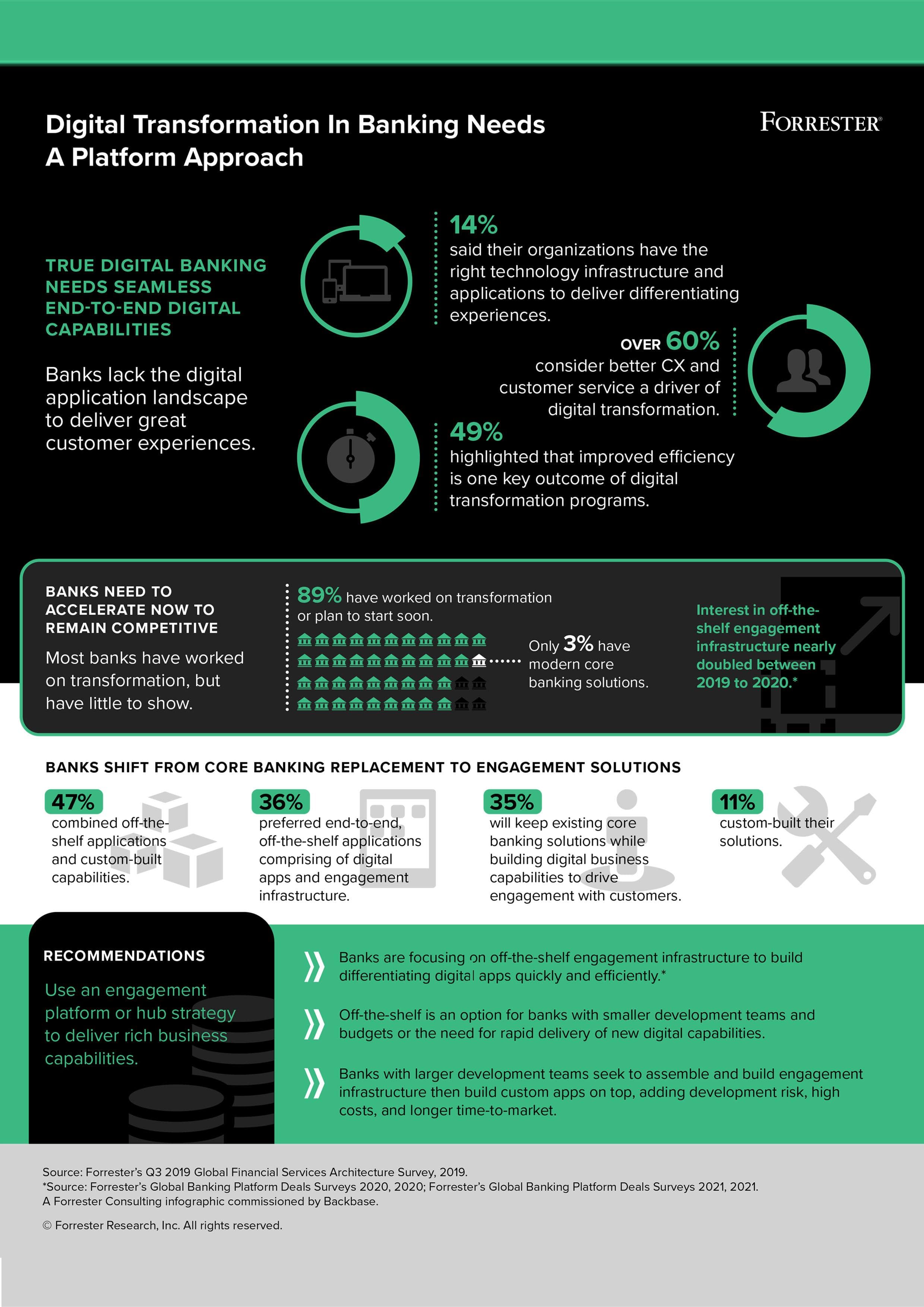 Backbase’s exclusive Forrester infographic makes the situation clear: whether financial institutions choose to adopt out-of-the-box digital infrastructure products or custom-build their own solutions, the only way forward is learning to own the customer engagement layer.