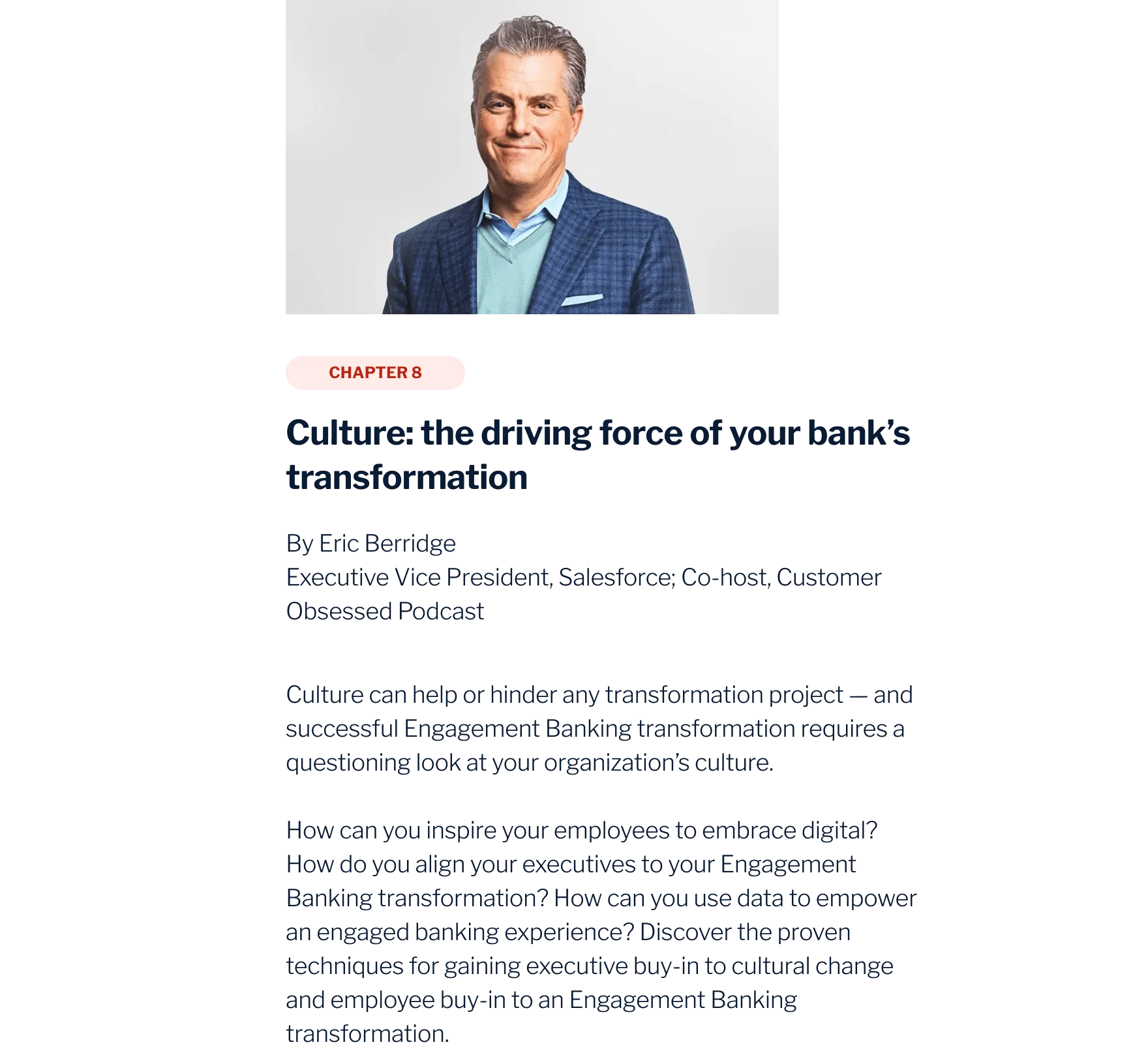 Culture: the driving force of your bank’s transformation By Eric Berridge Author; Executive Vice President, Salesforce; Co-host, Customer Obsessed Podcast