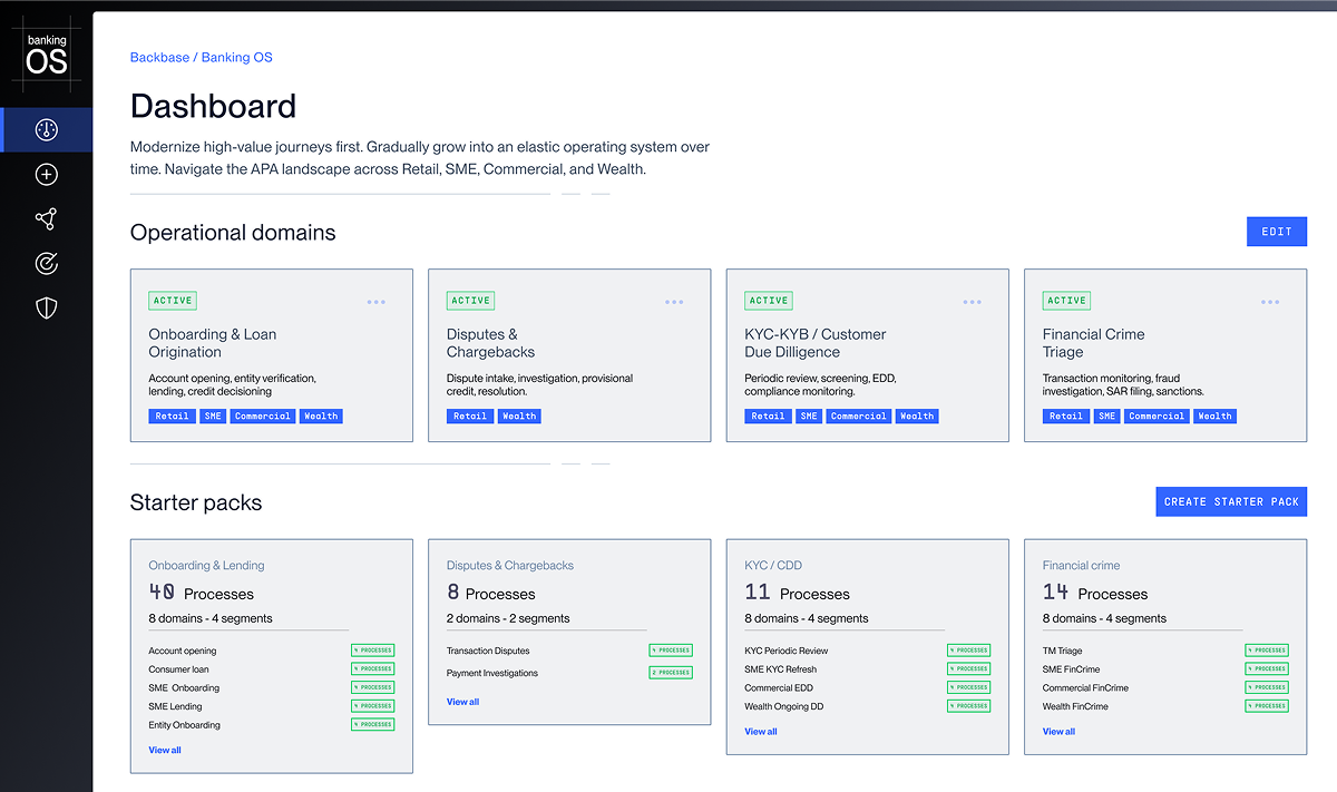 Pre-validated blueprints from 120+ real bank implementations. Workflows, semantic models, agents, policies, and integrations - bundled per domain.