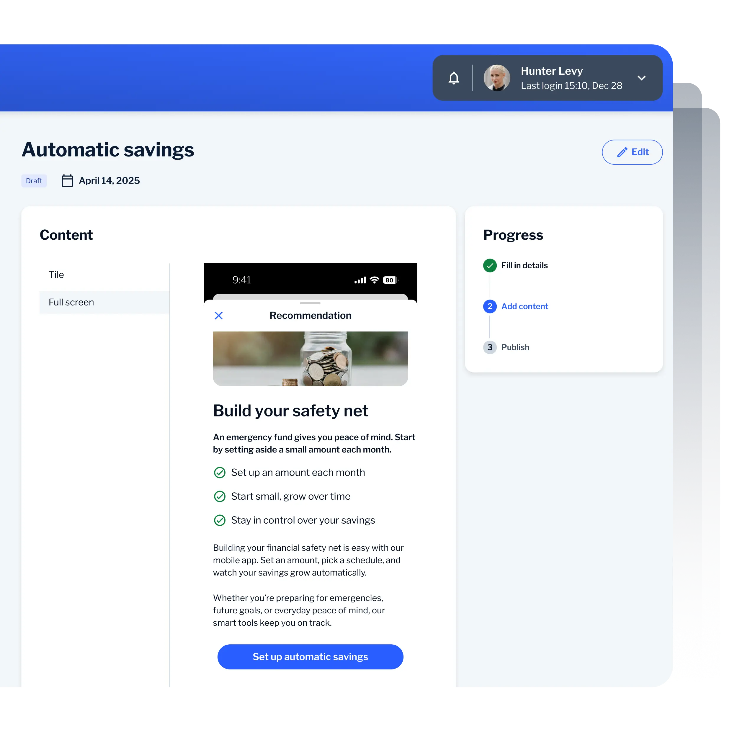 Rileva i momenti importanti e agisci di conseguenza all'istante. Usa segnali comportamentali, eventi della vita e cambiamenti nella salute finanziaria per attivare impulsi tempestivi e personalizzati. Che si tratti di suggerire una nuova tasca di risparmio o di chiedere una chiacchierata con un consulente, offri l'assistenza giusta al momento giusto, il tutto perfettamente integrato nella tua app. Promuovi l'azione, rafforza la fiducia e fai crescere ogni cliente.