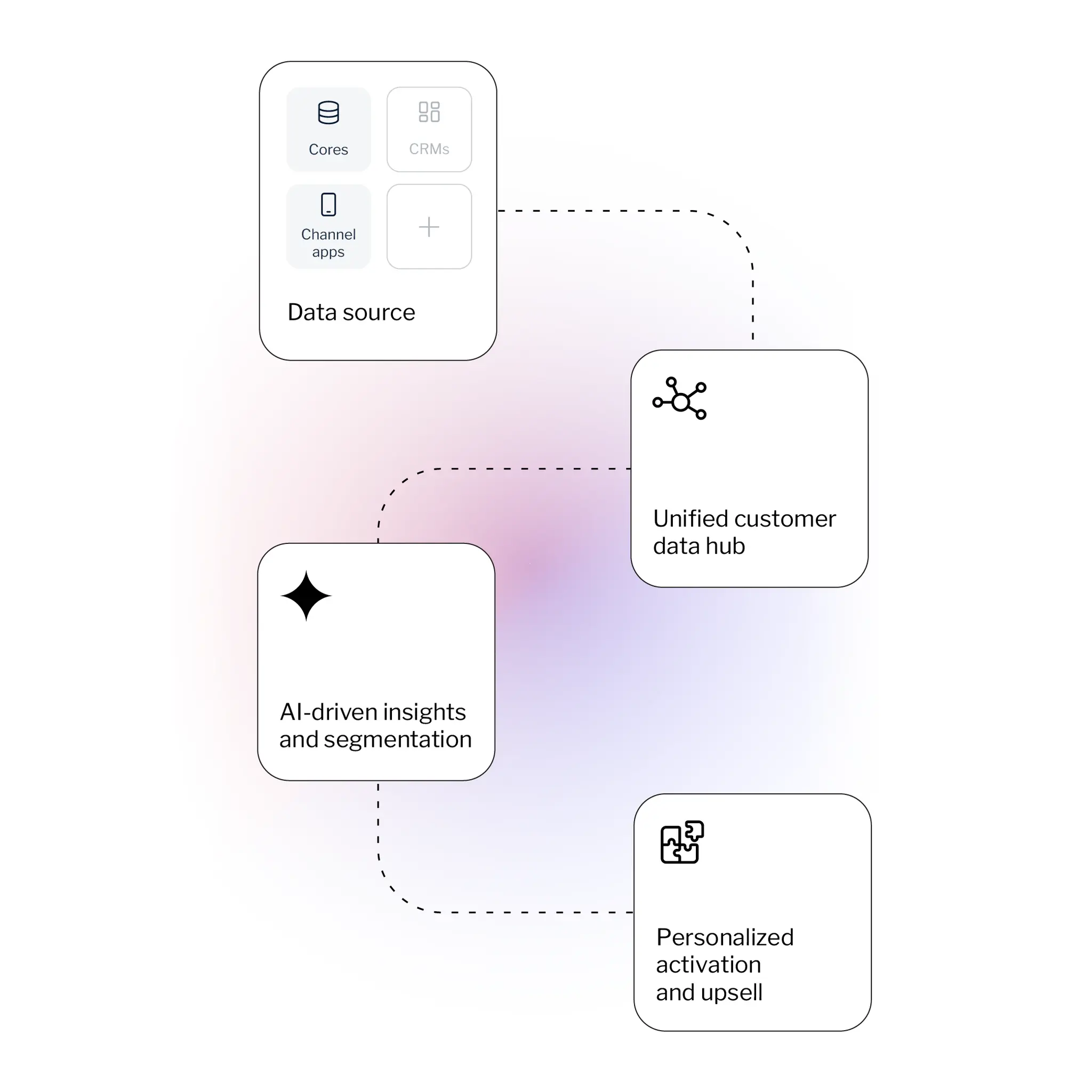 Potenzia il portafoglio di prodotti e massimizza il valore a lungo termine orchestrando il ciclo di vita del cliente su ogni canale e percorso. Abbattendo i silos, la tua banca può trasformare ogni interazione in un'opportunità di crescita mirata.