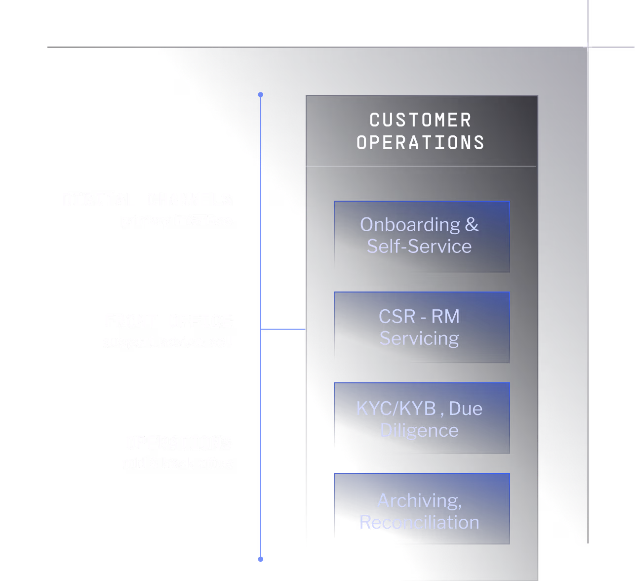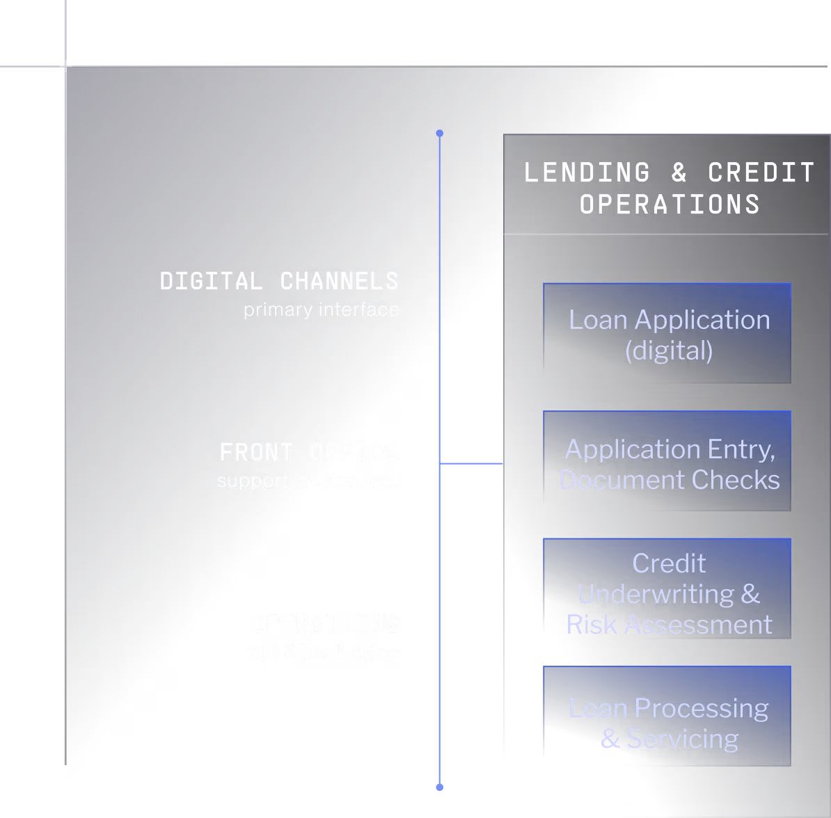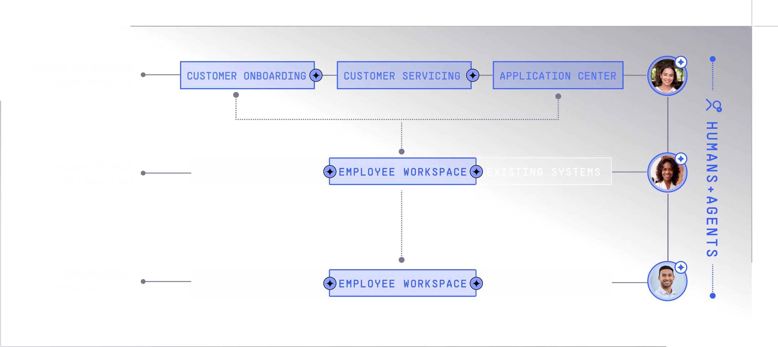 The Banking OS runs the full operation - onboarding, servicing, advice, sales, payments, disputes, lending, mid-office, back-office. Customers, employees, and agents resolve the same case on shared context, across digital channels, front office, and operations. The systems you already run stay where they are.